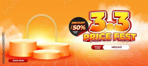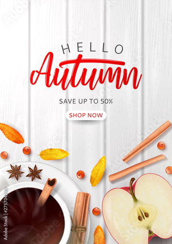 Juice packaging carton mockup on display podium, paper cut fall season background with red, yellow autumn leaves, vector illustration. Natural healthy food ads template.