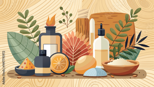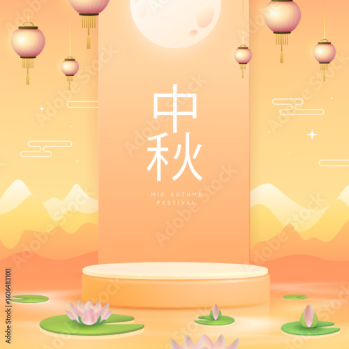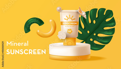 Juice packaging carton mockup on display podium, paper cut fall season background with red, yellow autumn leaves, vector illustration. Natural healthy food ads template.