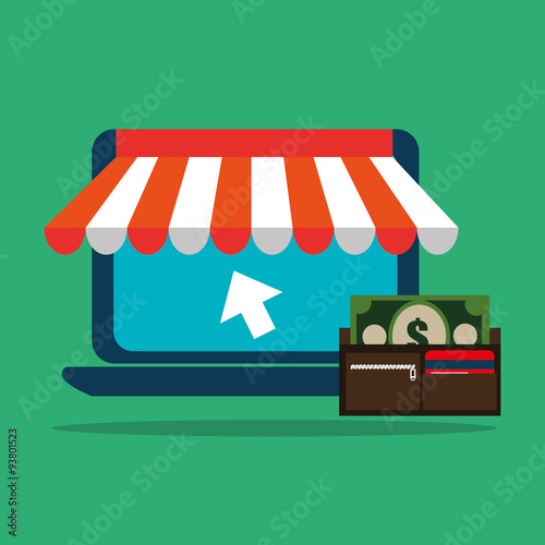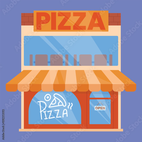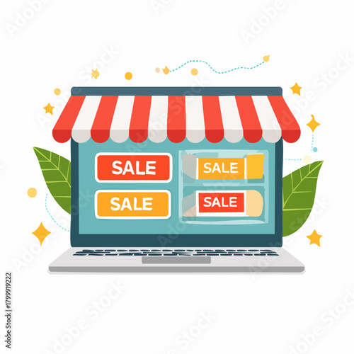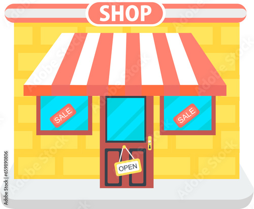 Juice store, flat vector illustration. Apple juice in display case. Salesman standing at counter. Supermarket, grocery store beverage section. Retail shop small business.