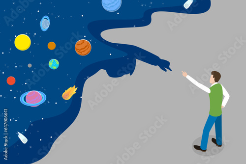 Kid is looking the stars with telescope. Universe discovery vector concept in paper art style. Origami paper cut design