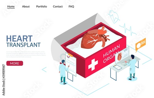 Kidney transplant vector website template, web page and landing page design for website and mobile site development. Human organ donation isometric composition with donor kidney in box and doctors.