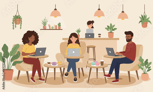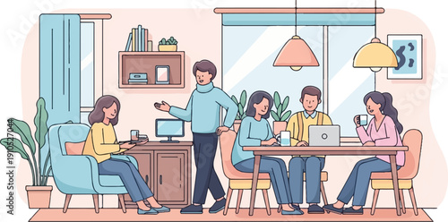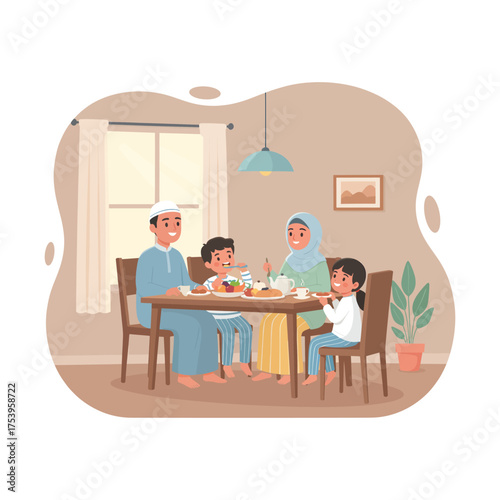 Kids birthday in multicultural family. International family concept vector illustration. Black father and white mother with two mixed kids. Child birthday party.