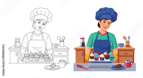 Kids cooking course vector scene set. Chef character teaching children to prepare food at restaurant kitchen isolated on white background. Education class for little boy and girl loving culinary