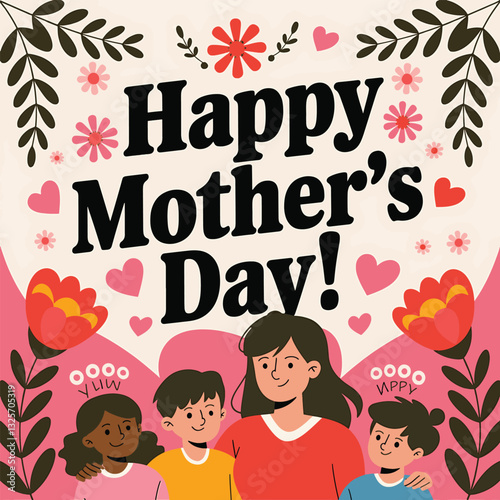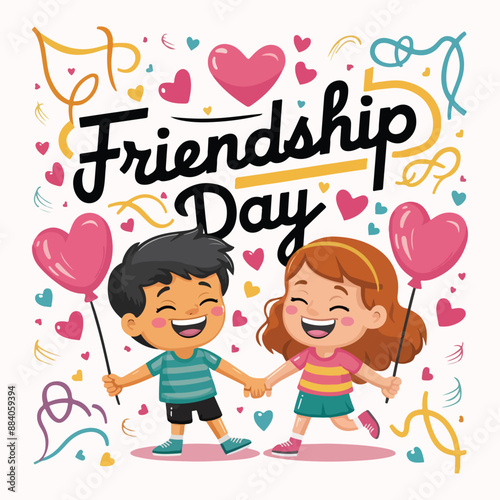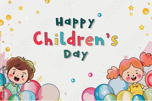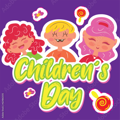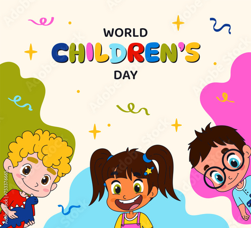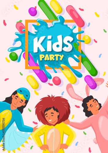 Kids party vector illustration with cartoon excited boys and girls wearing cute costumes happily jumping smiling and celebrating funny event