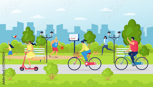Kindergarten playground concept vector illustration. Preschool teacher looking after kids swinging, sliding down the slide, playing in the playground. Flat style design.