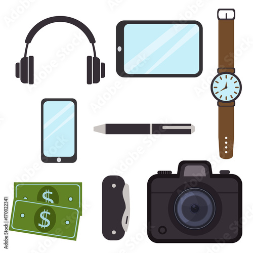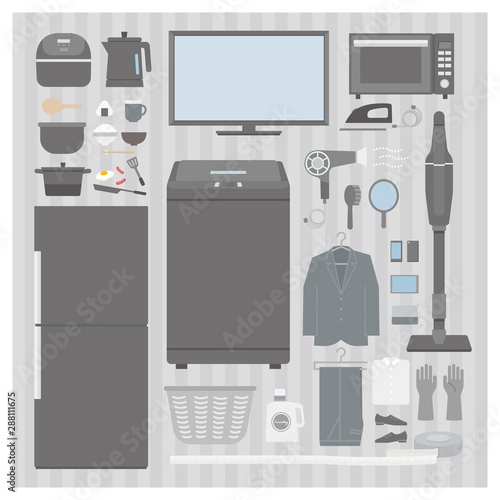 Kitchen appliances. Vector set of household electric appliances and utensils. Microwave, fridge, kettle, blender, oven.