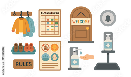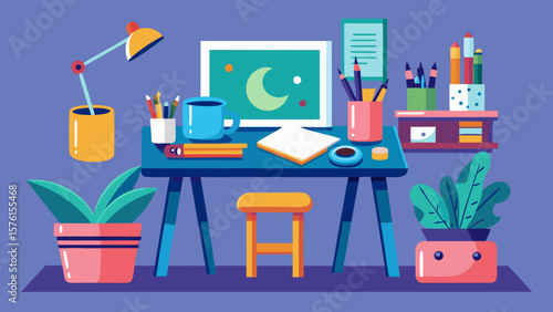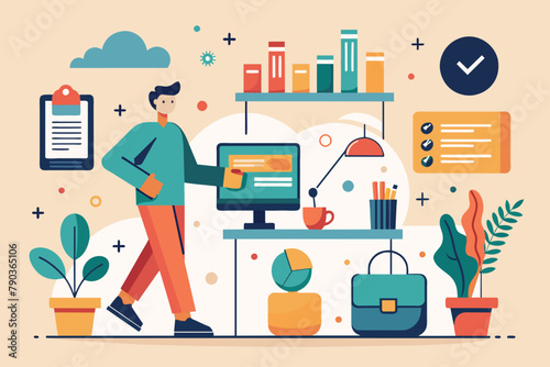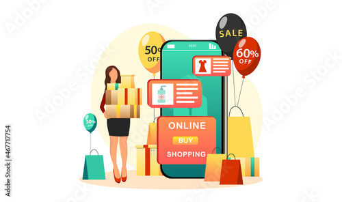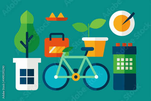 Kitchen interior with furniture and foodstuff for bike home food delivery theme poster, vector flat illustration. Kitchen room with wine pizza box, fast food on counter, delivery bike with grocery bag
