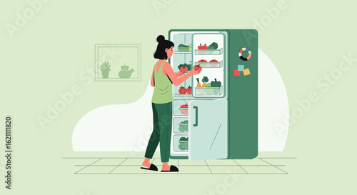Vector illustration of woman standing in front of opened fridge with food. Kitchen in the house flat style design element.