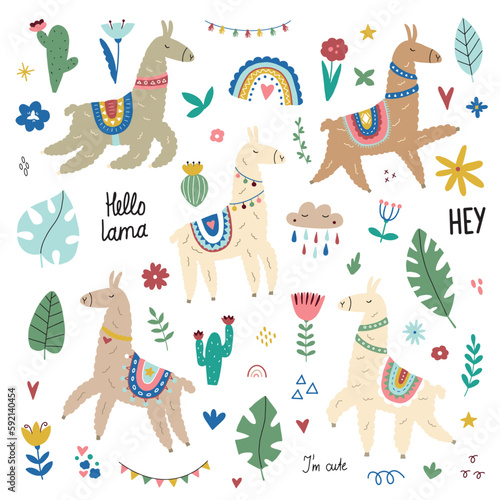 Lamas alpacas vector. Cute llama character isolated set on white background. Funny wild animal meditating, playing guitar, walking outdoors illustration