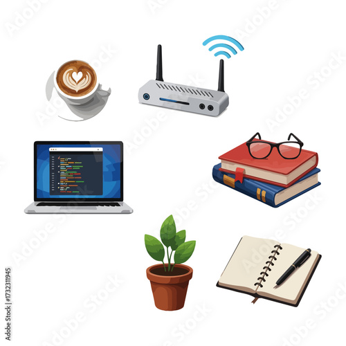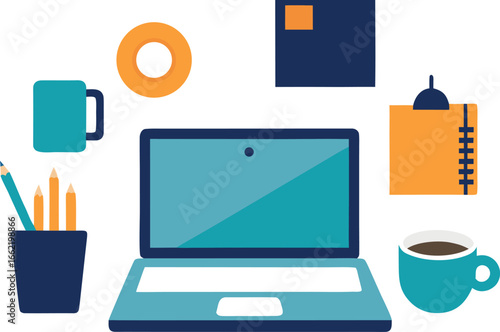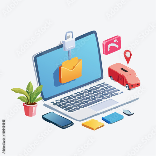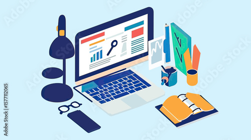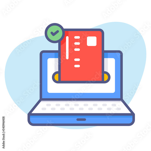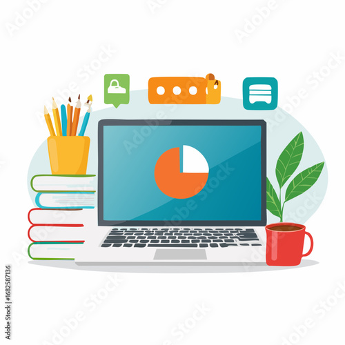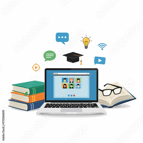 Laptop computer with backpack full of school supplies on screen, vector illustration. Online education, distance learning.