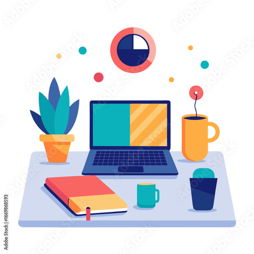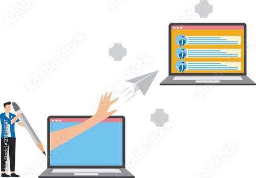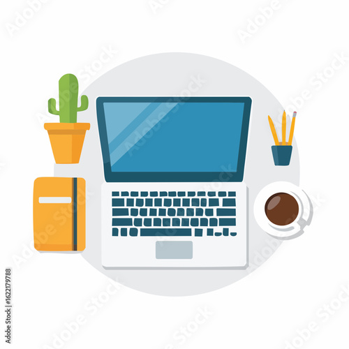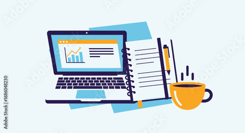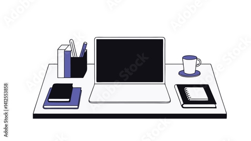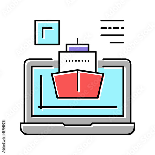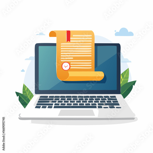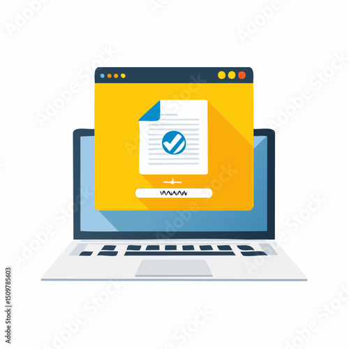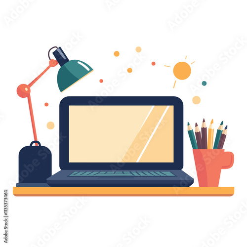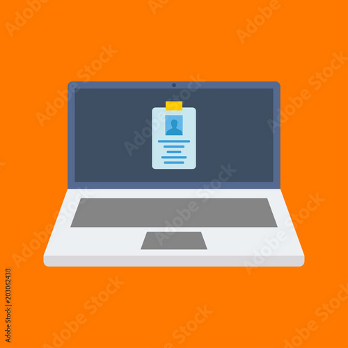 Laptop computer with backpack full of school supplies on screen, vector illustration. Online education, distance learning.