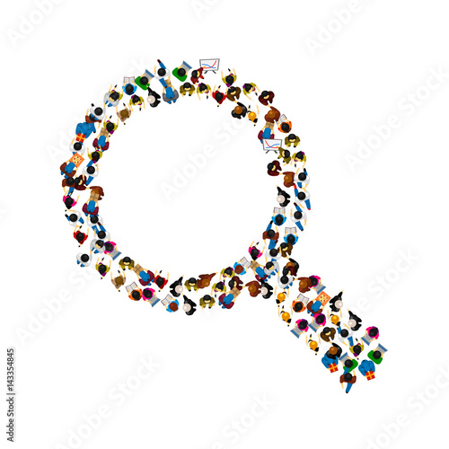 Large group of people standing together in the shape of magnifying glass, flat vector illustration. People crowd gathering. Hiring, employment, job search, recruitment, business career.