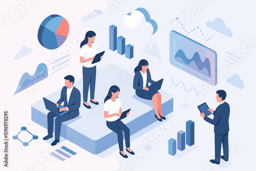 Cutaway laundry reception interior with receptionist and customer characters, flat vector isometric illustration. Laundry service.