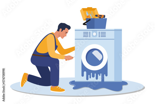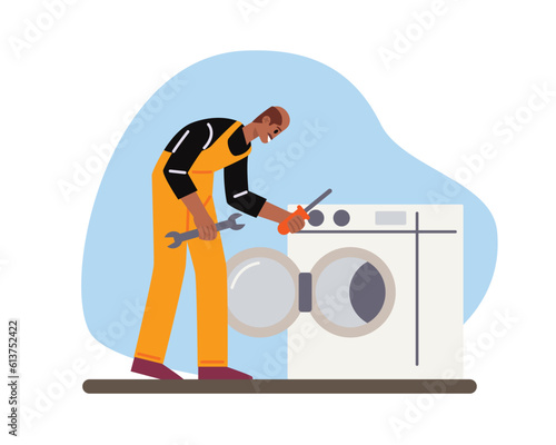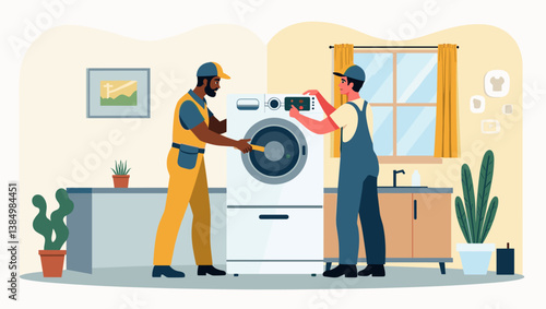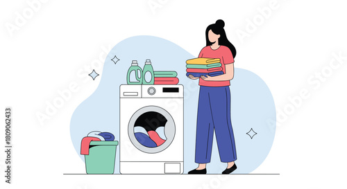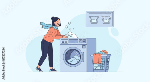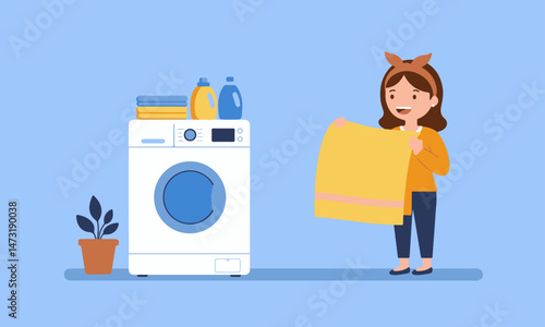 Laundry room with big washing machine and tiny characters, vector flat style design illustration. Coin laundry service concept for web banner, website page etc.
