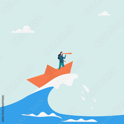 Leader and team in origami paper boat vector. Businessman boss chief looking through binocular searching way to success leading employee group. Business and leadership concept