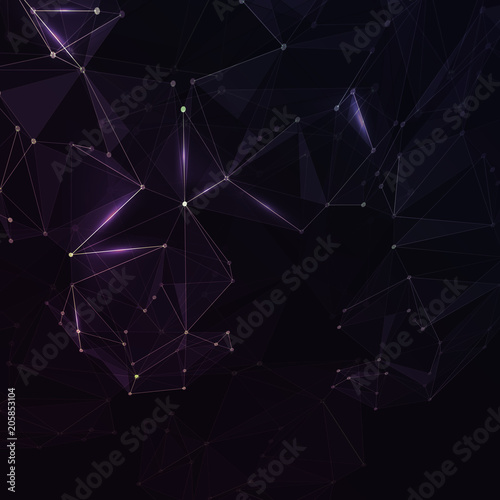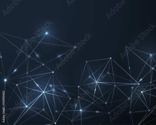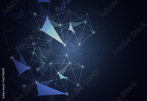 Vector polygonal art flying paper airplanes. Low poly wireframe mesh with scattered particles and light effects on dark blue background. Leader concept poster banner design template with copy space.