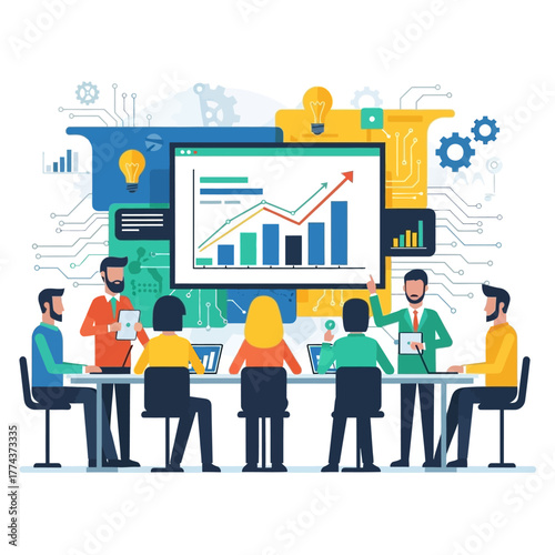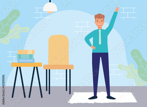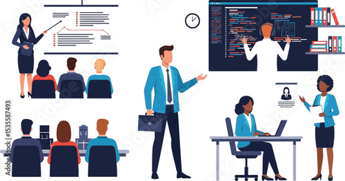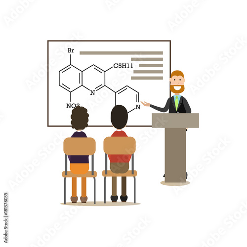 Vector illustration of chemistry teacher, university professor giving lecture. Lecture hall, classroom interior. Flat style design.