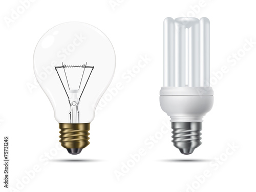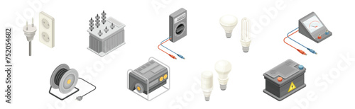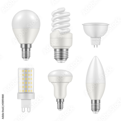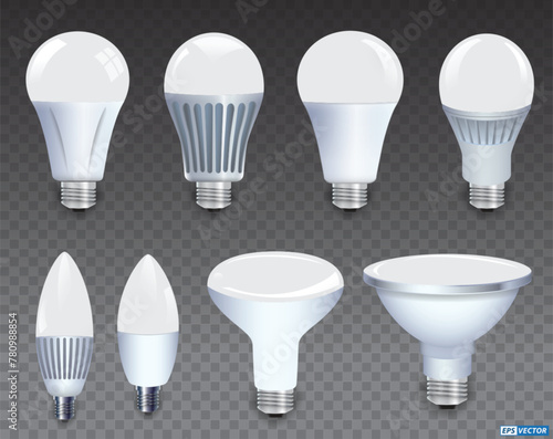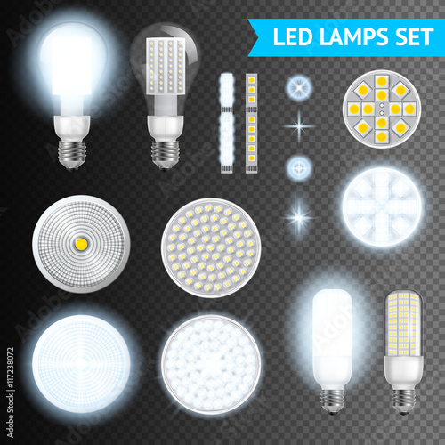 Led light bulb set, vector illustration isolated on transparent background. Floodlight and high bay fixtures, tube light, household lamps etc. Energy saving lamps.