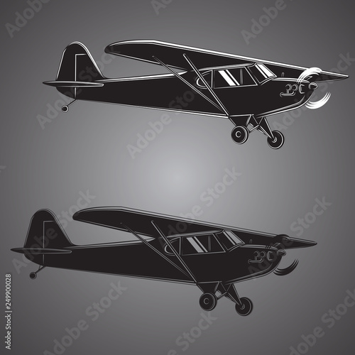 Lets travel concept vector illustration. Retro airplane poster. Old model plane is flying in the sky postcard. Bon Voyage.