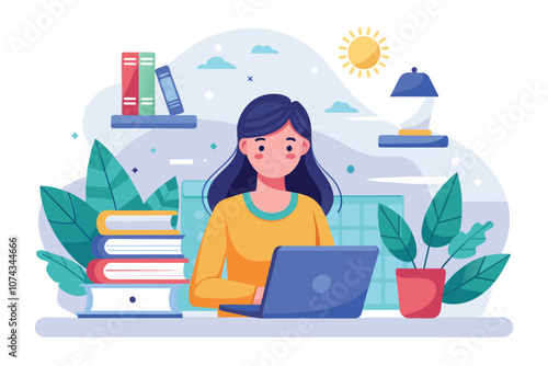 Library landing page design, website banner template set, flat vector illustration. Girl reader, student, bookworm reading book sitting at table with pile of books in library. Knowledge, education.