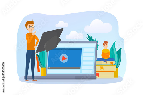 Library reception with male and female characters librarian, readers, vector illustration. Education concept for web banner, website page etc.