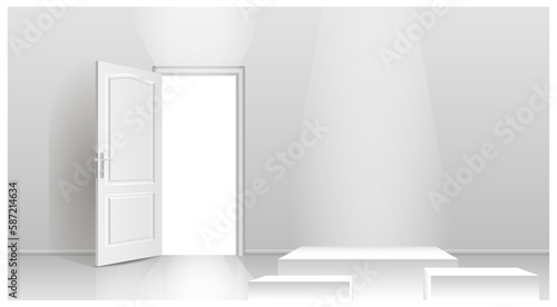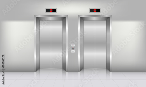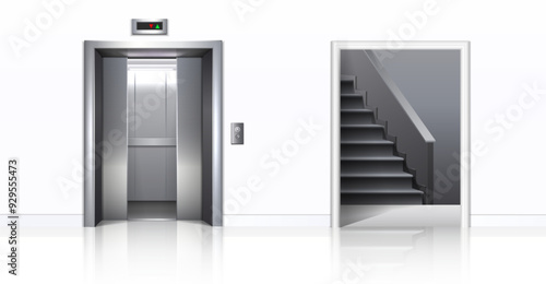 Lift door and stairs in lobby realistic vector. Elevator with closed metal gates and open door to upstairs illustration. Building hall interior design