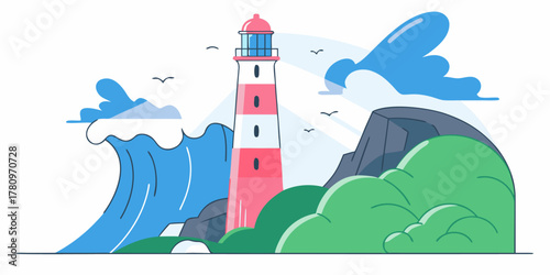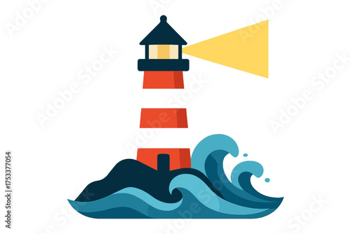 Lighthouse among raging waves in circle. Vector illustration in modern paper art style. Marine greeting card, cover, poster, banner design template.