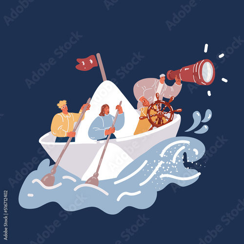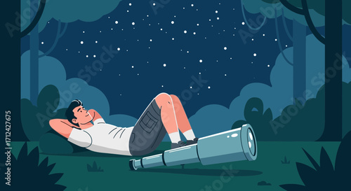 Little children looking through telescope into starry sky having fun time at night park vector illustration. Kids exploring outer space with planets and stars constellations