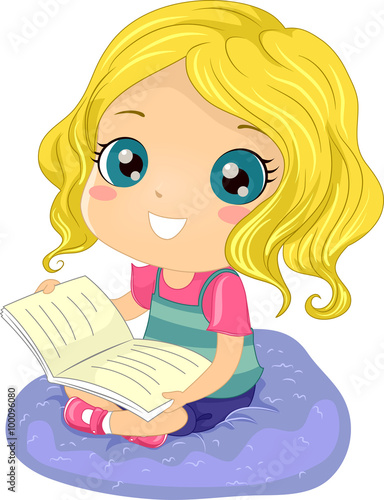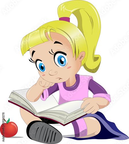 Little girl reading book on a bed. Vector illustration in comic pop art style. Girl dreaming about something reading tale.