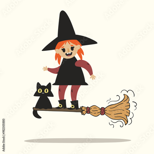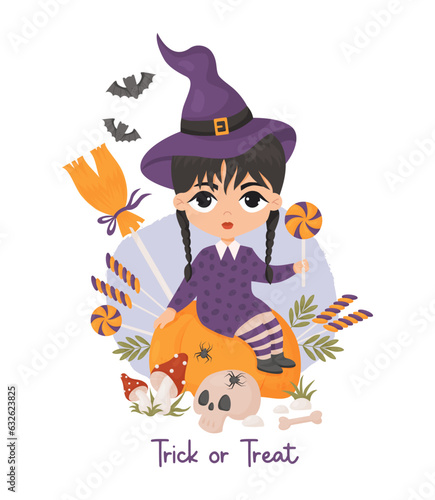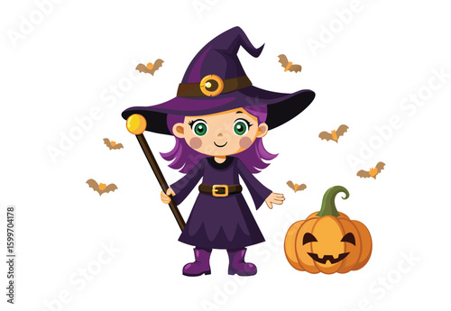 Little girl witch cartoon character wearing festive costume reading spell in magic book standing over boiling cauldron vector illustration. Halloween and witchcraft concept