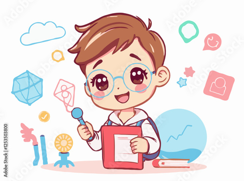 Little girl with presents and gift boxes. Birthday concept poster. Vector illustration in comic retro pop art style. Cartoon design elements and icons.