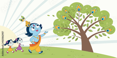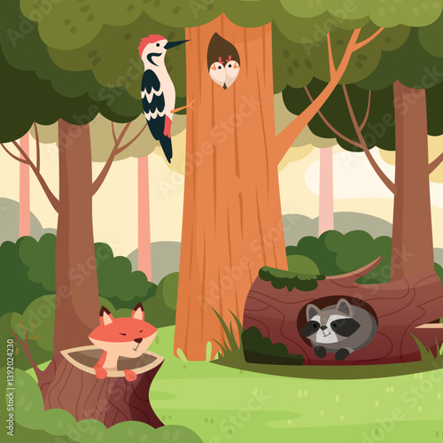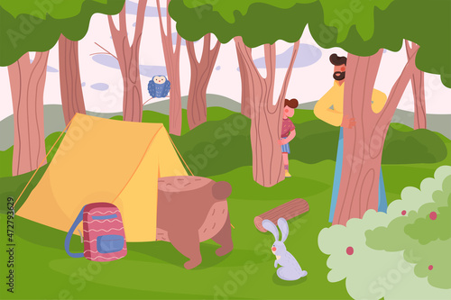 Little kids playing hide and seek game in forest vector illustration. Cartoon children summer vacation activity in mountain camp