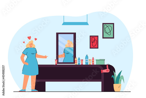 Living room interior and girl working on laptop lying on sofa vector flat illustration. Woman living hall with cozy couch by the window, coffee table, floor lamp, books on carpet. Modern home interior