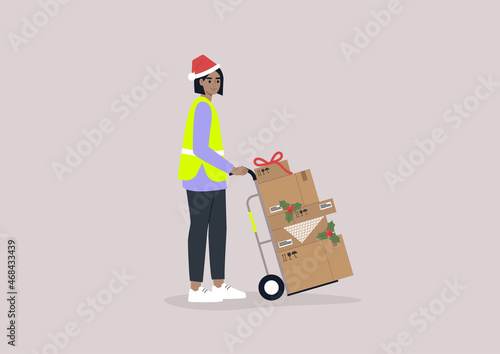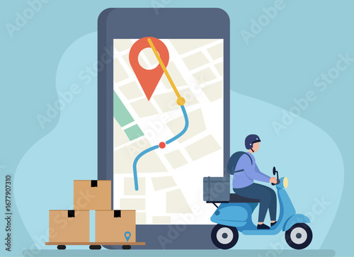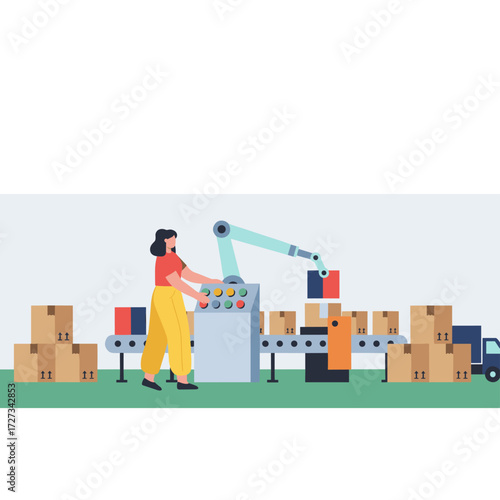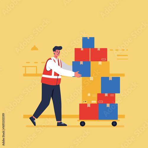Vector illustration of worker pushing cargo cart or platform trolley with cardboard boxes. Delivery company services. Loader concept flat style design element.