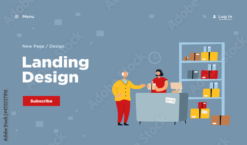 Vector illustration of porter pushing cart with fridge in carton box. Moving and delivery company services. Loader concept flat style design element.