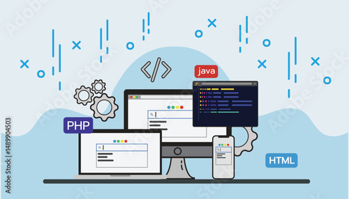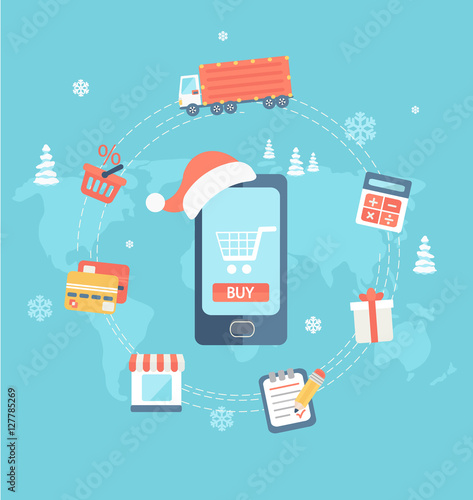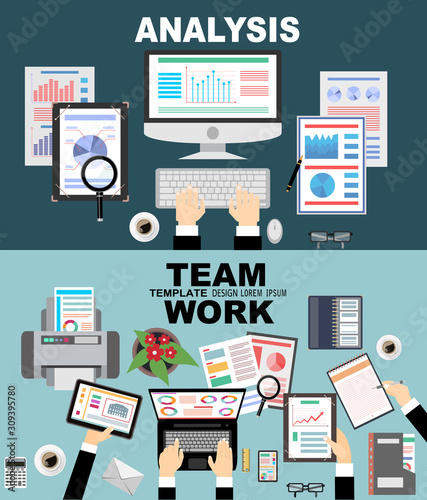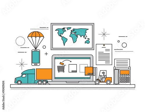 Professional moving and delivery company loader services concept vector illustration. Micro male and female characters loading cardboard boxes on huge cargo trolley, cart or loader.
