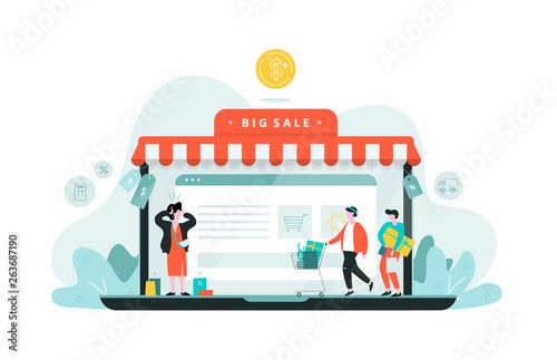 Local market, vector flat style design illustration. Seller or farmer female character selling natural organic fruit and vegetables to shopper young woman. Healthy fresh organic food.