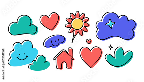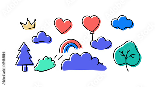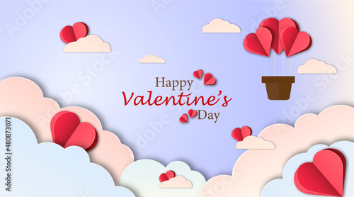 Vector layered paper cut style sky with clouds, flying heart hot air balloon, cute girl falling in love sitting on fluffy clouds. Sweet dreams about love concept. Valentines Day greeting card template