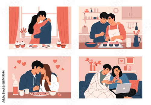 Love set. Romantic people illustration. Flat vector character. Young man and woman loving healthy organic food scene. Old boyfriend and girlfriend online web chat. Couple celebrating child birth