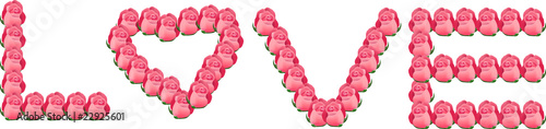Love word made of beautiful paper cut pink flowers and hearts. Romantic floral greeting card, invitation design. Vector illustration in paper art style. Love stylized typography banner template.
