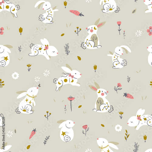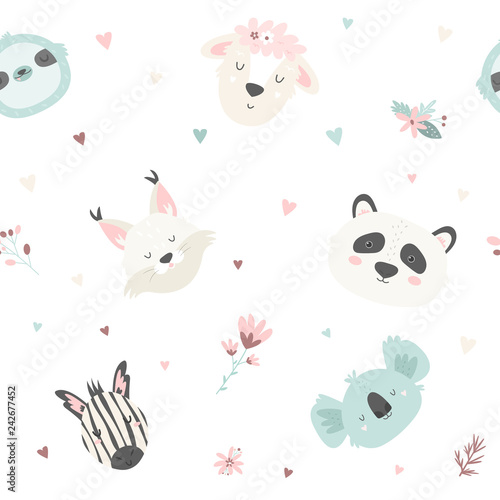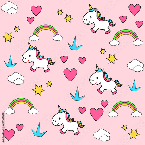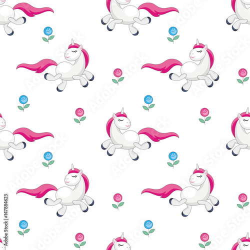Magic unicorn seamless pattern. Vector hand drawn romantic unicorns, ice cream cones, flowers, hearts.