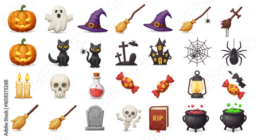 Magician hat set, flat vector isolated illustration. Illusionist hand with wand and magic cylinder hat for performing tricks with bird, rabbit, bouquet of flowers, ribbons, playing cards.