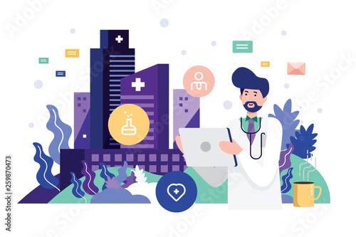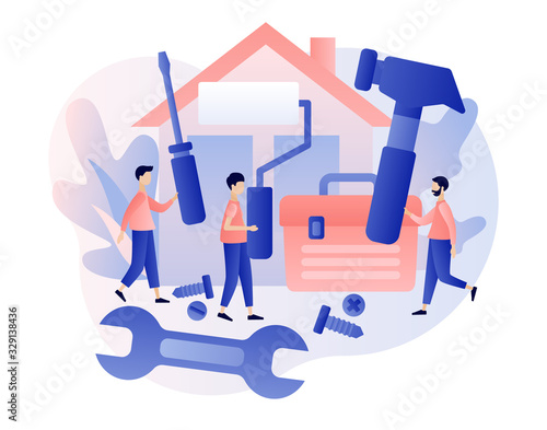 Huge cosmetic bag with beauty products blush, eyeshadow, lipstick, mascara, eyeliner and micro characters. Beauty salon, makeup studio services concept for web banner, website page etc.