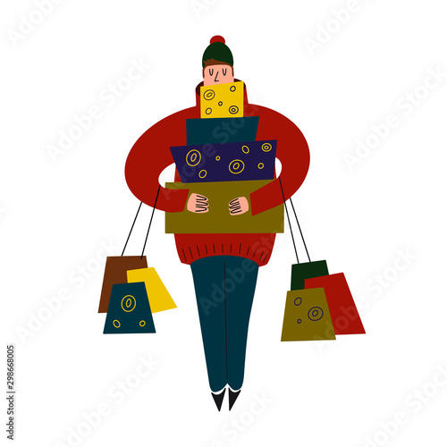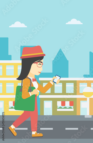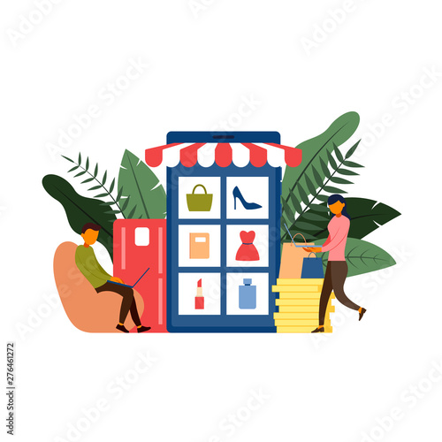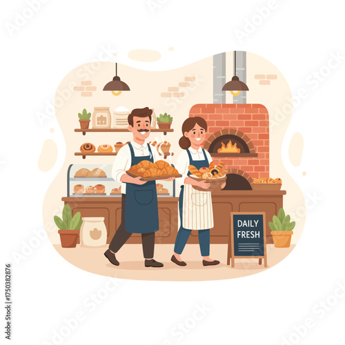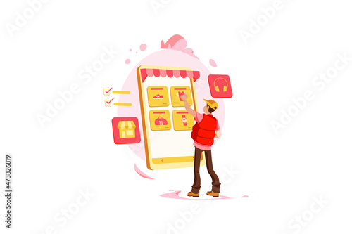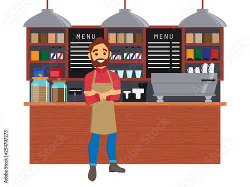 Vector illustration of coffee house worker female making coffee. Coffee shop interior with commercial espresso coffee automatic machine. Flat style design.