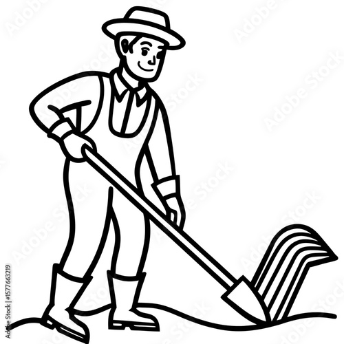 Male asian farmer plowing garden soil vector icon isolated background.