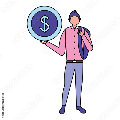 Man and money coin stack vector. Economy or investment 3d illustration. Budget increase, financial growth and success isometric icon isolated on white background