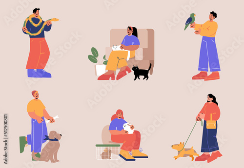 Man and woman characters harvest fruits in farm graden. Vector illustration set of farmer people work in apple garden and picking fruits from tree. Harvesting season, agriculture, farm.