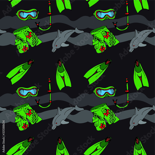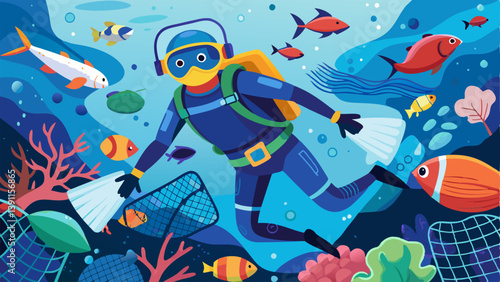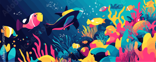Man and woman couple wearing aqualung and suit enjoying romantic scuba diving swimming together underwater watching sea ocean inhabitant and coral reef vector illustration