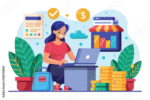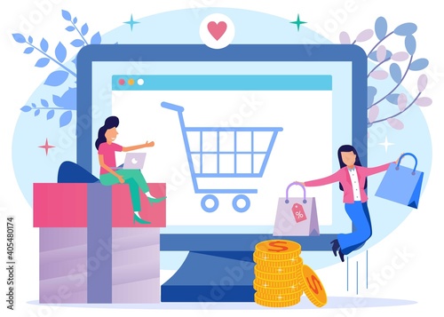 Man and woman discuss business strategy in office. Busines team work concept illustration. Vector web site design template. Office desk with computer and coffee. Financial charts on computer screen.
