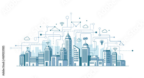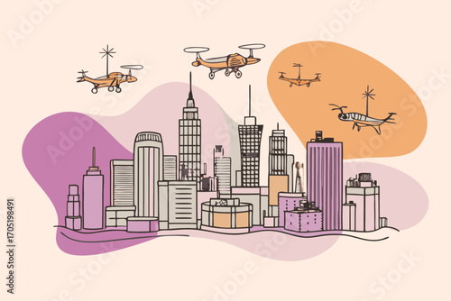 Modern city building silhouettes. Young man riding electric kick scooter, woman riding bicycle on the street, vector illustration in paper art style. Modern vehicle, eco city transport.